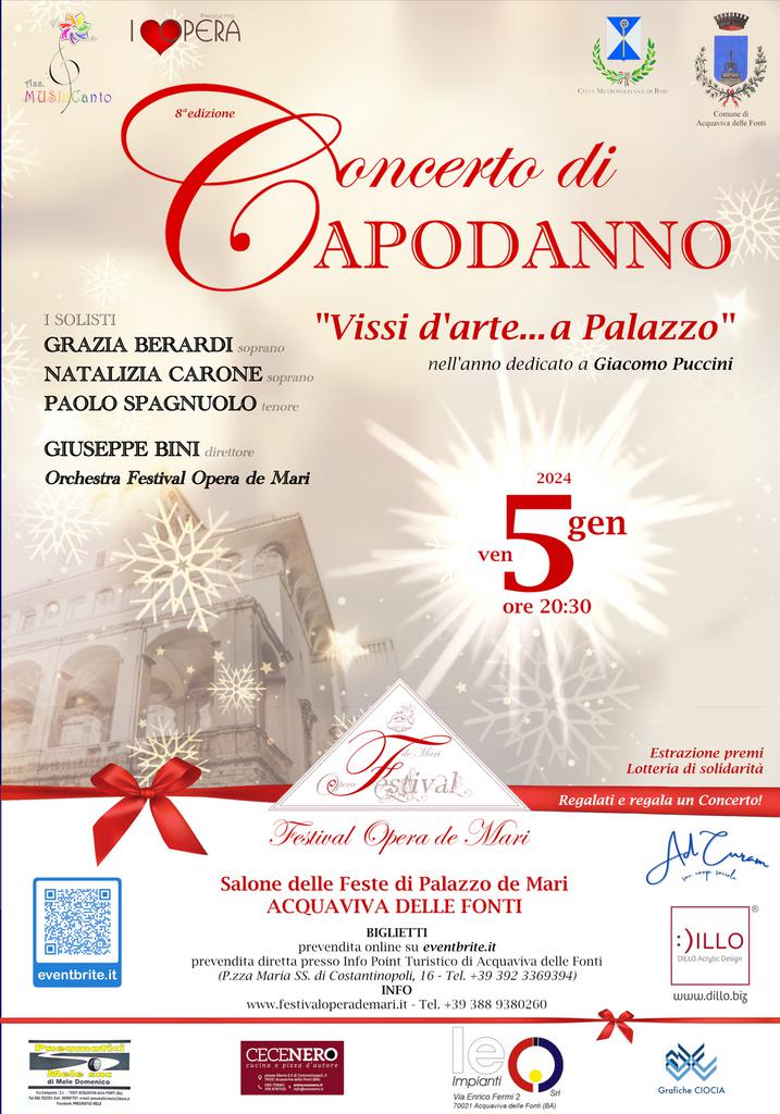 Ritorna, nella sua ottava edizione, il tanto atteso appuntamento musicale di inizio anno ad Acquaviva delle Fonti, con il gran Concerto di Capodanno del Festival Opera de Mari, quest'anno intitolato "Vissi d'arte...a Palazzo" e dedicato al grande compositore Giacomo Puccini nel centenario della sua morte.