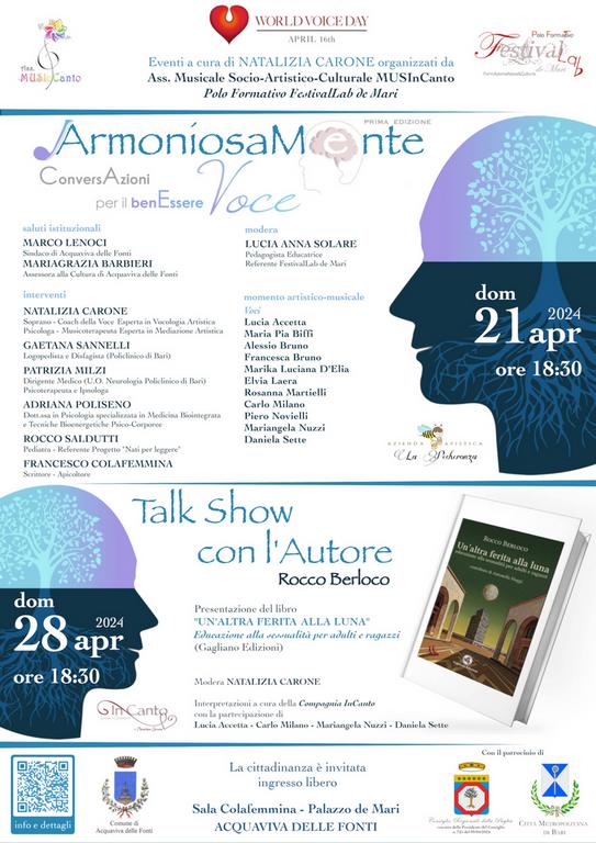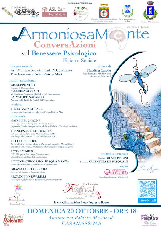 ArmoniosaMente - ConversAzioni sul benessere Psicologico, Fisico e Sociale è, infatti, una iniziativa nata nel 2023 come format itinerante, organizzata dall’Associazione MUSInCanto di Acquaviva delle Fonti da un progetto proprio della Carone che ha scelto di unire le proprie competenze e attività professionali in ambito artistico e sanitario consapevole del fatto che l’arte in tutte le sue declinazioni e la psicologia sono da sempre interconnesse.