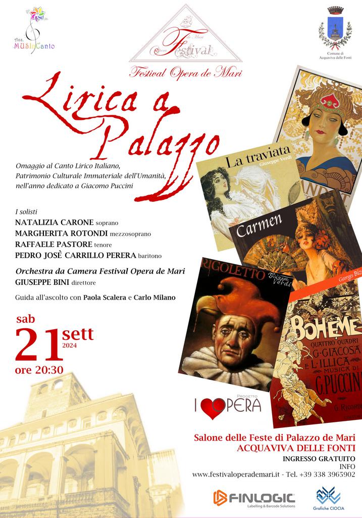 Lirica a PalazzoOmaggio al Canto Lirico Italiano,Patrimonio Culturale Immateriale dell'Umanità,nell'anno dedicato a Giacomo Puccini21 settembre 2024 ore 20:30Salone delle Feste di Palazzo de Mari - Acquaviva delle Fonti