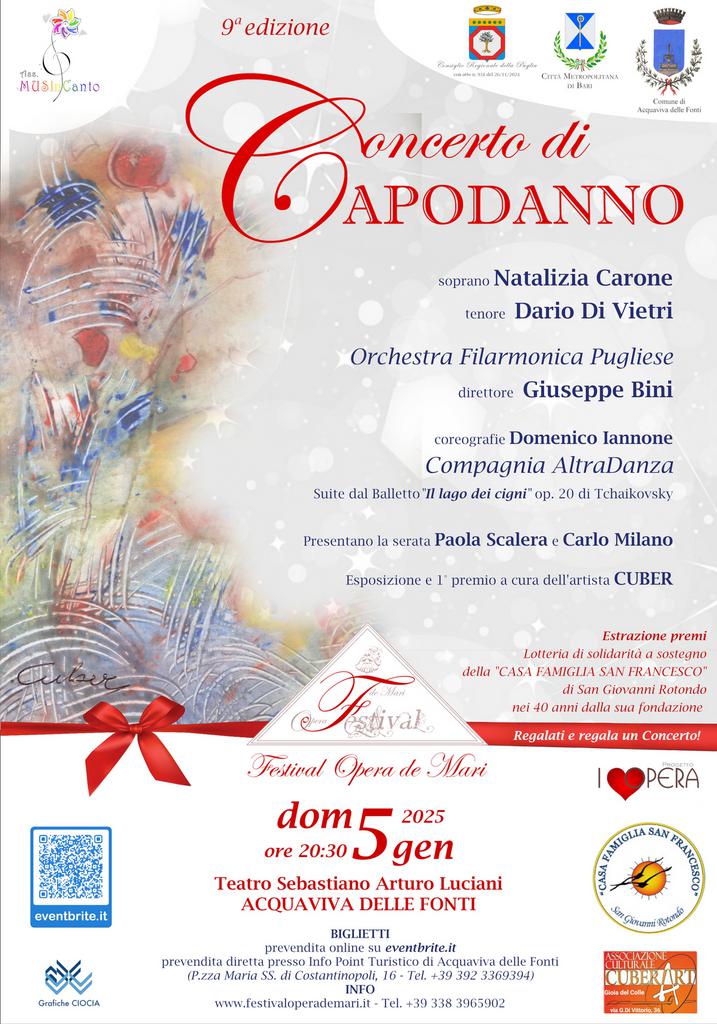 Ritorna, nella sua nona edizione, il tanto atteso appuntamento musicale di inizio anno ad Acquaviva delle Fonti, con il gran CONCERTO DI CAPODANNO del Festival Opera de Mari. Giovedì 5 gennaio alle 20,30, nel Teatro Luciani di Acquaviva delle Fonti, andrà in scena una grande kermesse musicale all’insegna della lirica, del balletto e del repertorio sinfonico dei grandi concerti di Capodanno in pieno nello stile romantico. Sul palco l’Orchestra Filarmonica Pugliese diretta dal M° Giuseppe Bini, con i solisti cantanti il soprano Natalizia Carone e il tenore Dario Di Vietri, la Compagnia AltraDanza con le coreografie di Domenico Iannone sulle musiche della Suite dal Balletto "Il lago dei cigni" di Tchaikovsky. Presenteranno la serata i giovani Paola Scalera e Carlo MIlano, che introdurranno il pubblico con un ascolto guidato al ricco programma della serata.
